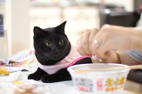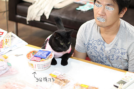 なぜかニャオスも一緒にカップ麺の3分を待っていました![]()